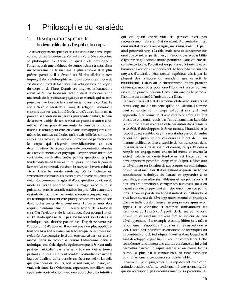L’auteur insiste sur l’importance de l’entraînement équilibré entre kihon (techniques de base), kata (formes) et kumite (combat). Il développe aussi la place de l’équipement de protection, notamment le bogu, pour permettre un combat réaliste sans danger excessif, une innovation introduite par son père.