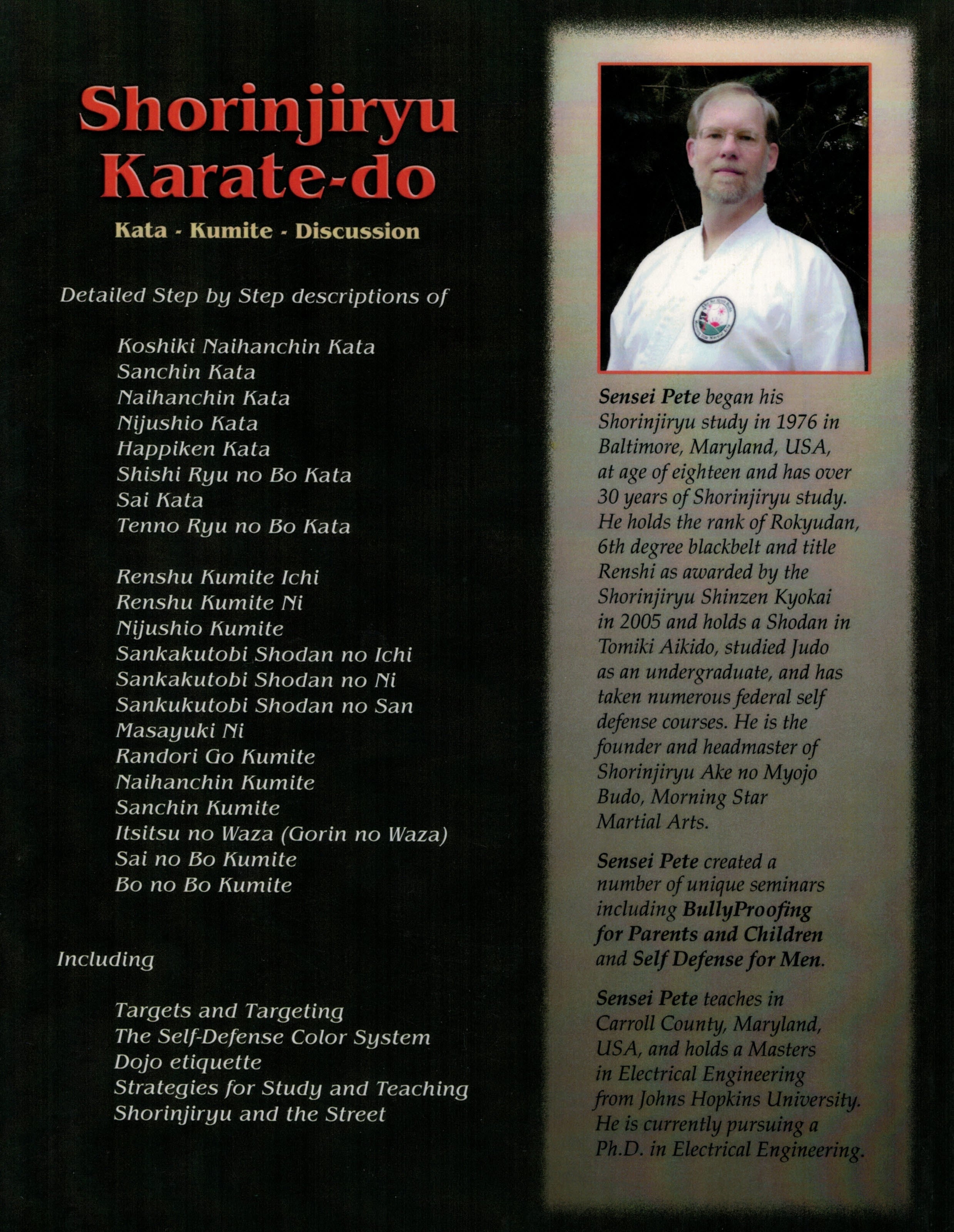 Sensei Pete began his Shorinjiryu study in 1976 in Baltimore, Maryland, USA, at age of eighteen and has over 30 years of Shorinjiryu study.